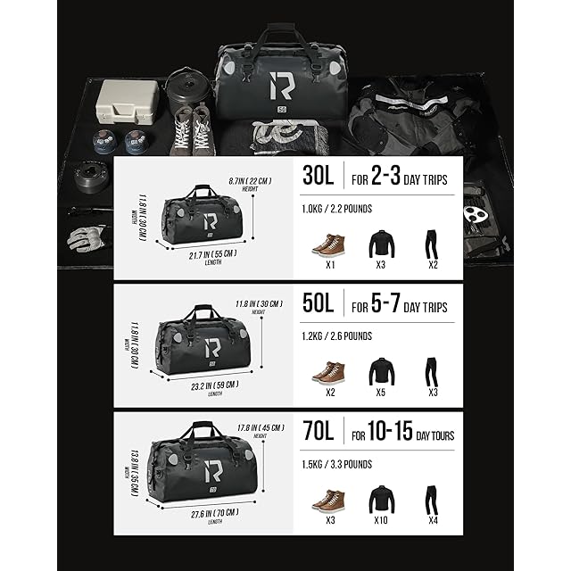 【十分な容量】30L、50L、70Ⅼの大容量を備えたこのバイクツーリングバッグは、十分な収納スペースを提供します。さらに、内部ポケット(30Lは15インチのタブレットを収納可能、50Lと70Lは17インチのタブレットを収納可能)と外部メッシュポケットにより追加の収納オプションが提供されたと同時に、お荷物の乾湿分離が実現されました。バッグにはモールシステムデザインもついており、キーホルダーや水筒などを掛けることができます。また、ロールトップな閉じる方法で、防水性があり、物を取り出すのが便利で、さらにシートバッグの容量を自由に調整できるので、非常に実用的です