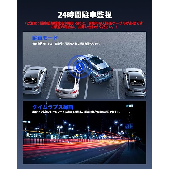 【常時録画・Gセンサー・24時間駐車監視】電源を入れると自動的に録画を開始し、古いファイルを上書きしながら録画を続けるため、メモリ不足の心配はありません。内蔵された高感度Gセンサーは、走行中や駐車中に衝撃を検知すると、現在の動画を自動的にロックし、緊急録画ファイルとして保存して上書きされません。さらに、タイムラプス録画と駐車監視の2つの駐車モードがあり、車内防犯カメラとして車両が停止している間も愛車を守り続けます。① タイムラプス録画モードでは、車のエンジンが切れていても、1秒間に1フレームのペースで録画を続け、1つの完結した動画ファイルを生成します。② 駐車監視モードでは、外部からの衝撃を検知すると、30秒間の動画を自動的に録画し、そのファイルはロックされて保存され、上書きや削除されることはありません。(タイムラプス録画および駐車監視機能を使用するには、専用のType-C ACC降圧ケーブルが必要です。必要な場合は、お問い合わせください。)