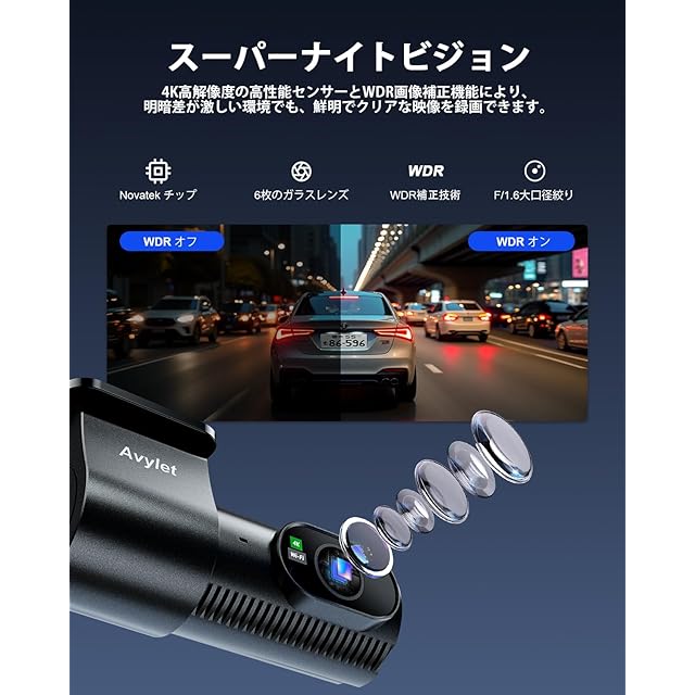 【前後同時録画・4K綺麗鮮明な画質・スーパーナイトビジョン・170°広角】2025年に新たに発売されたAvyletのドライブレコーダーは、4Kのフロントカメラと1080Pのリアカメラを搭載した前後2カメラシステムで、業界トップクラスの画質を実現しています。4Kの超高解像度により、鮮明な映像をしっかりと録画できます。また、他社のF/1.8よりも高性能なF/1.6の大口径絞りと6枚のガラスレンズを採用し、光透過率は90%以上に達しており、夜間や悪天候でもクリアで鮮明な映像を提供します。さらに、WDR技術を搭載しており、逆光やトンネルの入り口など、明暗差の大きいシーンでも自動でコントラストを調整し、白飛びや黒潰れを防止します。加えて、170°の超広角レンズにより、前方の広範囲をカバーし、緊急車線変更や前方の障害物、交差点での事故、周囲の車両の動きなど、運転中に発生するあらゆる状況を正確に捉えることができます。