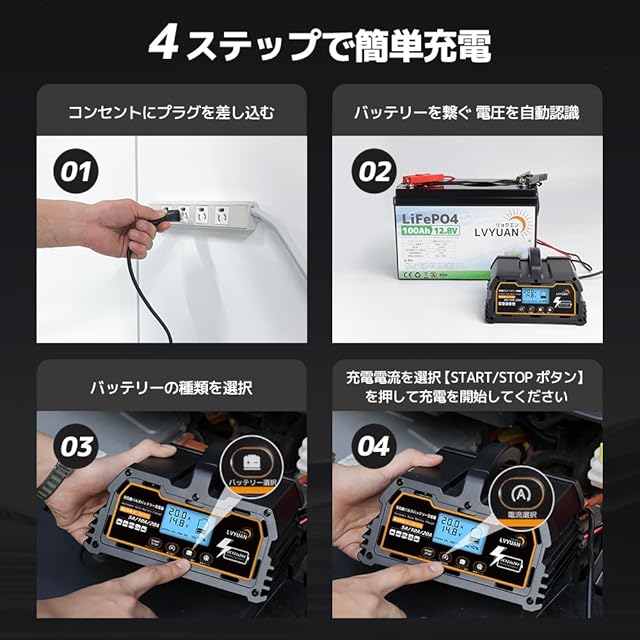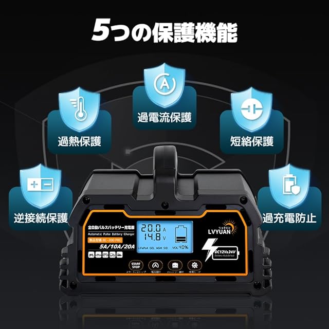 全自動パルスバッテリー充電器 LVYUAN(リョクエン)(正規品)自動パルスバッテリー充電器 定格20A 12V/24V対応 維持充電 緊急時 全自動 スマートチャージャー バッテリー診断機能付 AGM/GEL車充電可能 12V LiFePO4 リン酸鉄リチウム電池対応 バイク ・自動車・農機・建設機械・小型船舶など日本語説明書 「パルス充電」 「サルフェーション除去(脱硫)」