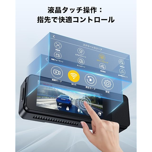 【3.18インチ液晶画面搭載】 高品質な3.18インチタッチスクリーンを採用し、直感的でスムーズな操作が可能です。録画の設定変更や映像の再生、ファイル管理など、さまざまな機能を簡単に操作できるだけでなく、車内で録画中の映像をリアルタイムで確認することもできます。使いやすさと実用性を兼ね備えた画面で、より快適なドライブをサポートします。