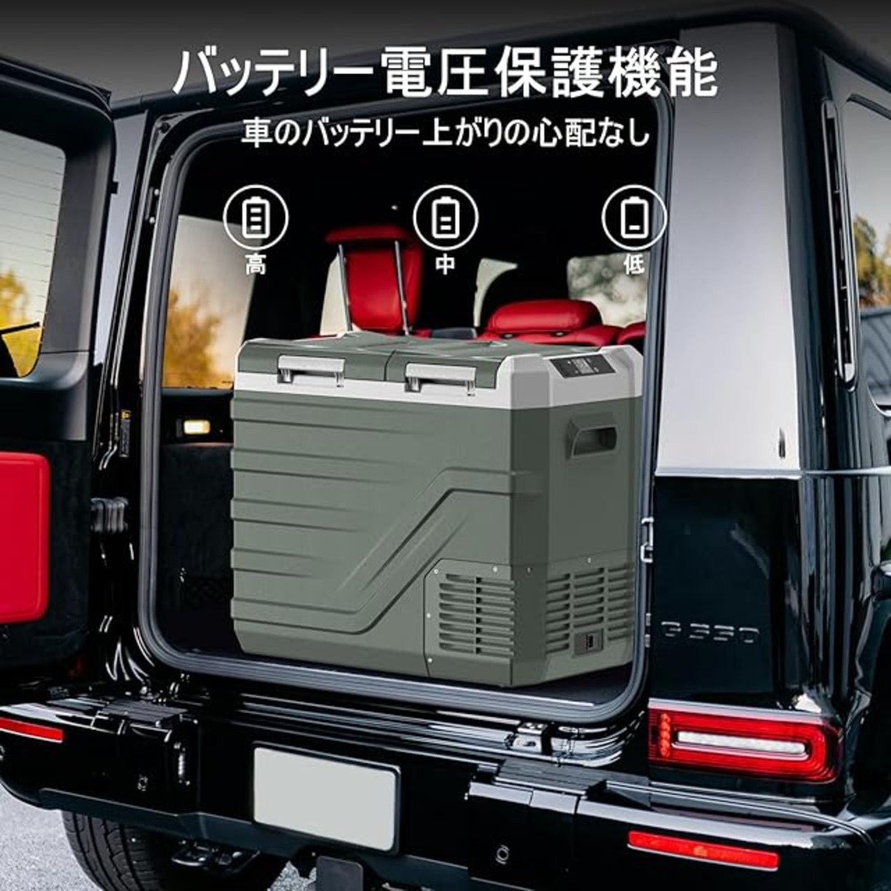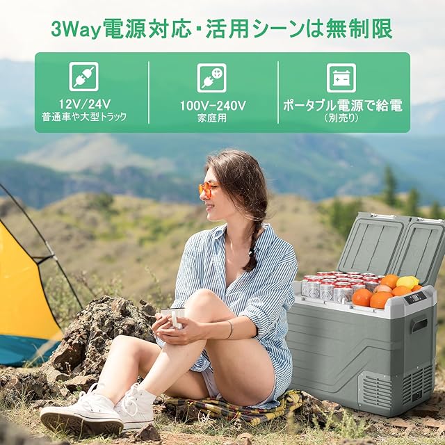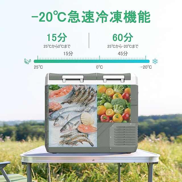 【2室独立温度制御】車載 冷蔵庫は左右に分かれた二室を、別々の温度に設定できることです。それにより、冷凍品と冷蔵品をこれ一つで同時に収納できます。例えば、左室は6℃で食材や飲み物を冷蔵し、右室は₋20℃で冷凍食品や氷を冷凍しておけます。冷凍と冷蔵が庫内で仕切られているため、各食材に合わせた温度を保つことができ、遠くのキャンプ場に出かけた際でも新鮮な食材を味わうことができます。