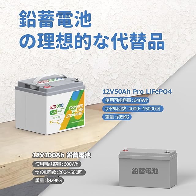 Redodo 12V 50Ah PRO リン酸鉄リチウムイオンバッテリー 640Wh 10年寿命 軽量 小型化12v LiFePO4 BMS保護 充放電サイクル4000回以上 RV キャンピングカー キャンプ ボート アウトドア活動 防災対策 ソーラー蓄電 PSE技術適合
