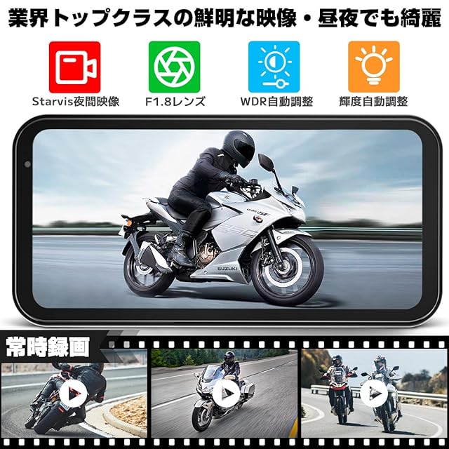 【前後1080P同時録画+IMX307センサー搭載+WDR機能対応】F83バイクドラレコは前後同時に1080Pで撮影することが対応しており、前後対角162°広角レンズとソニー製感光センサーIMX307も搭載搭載されているため、光線や色彩を敏感的に捉え、目視と近い映像を再現できます。他社製センサーより、IMX307はWDR機能も対応しているため、黒つぶれや白飛び、映像ノイズなどを上手に抑えて、昼間と夜間両方も鮮明で綺麗な映像を撮影できます。