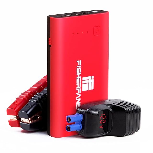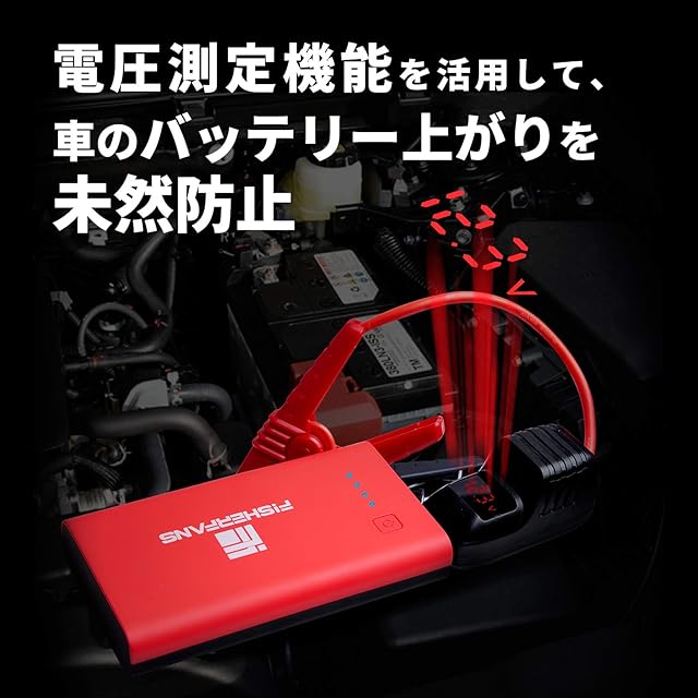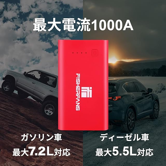 FISHERFANS FF1 車 バイク ジャンプスターター 大容量12800mAh 小型軽量 12V ピーク電流1000A QDSPブースター技術 最大7.2Lガソリン車・5.5ディーゼル車対応 Type-C搭載 LED応急ライト搭載 防災グッズ 24ヶ月保証付 エンジンスターター レッド バッテリー上がり モバイルバッテリー