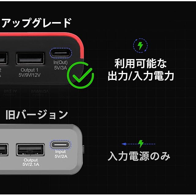 ●【Type-C出力入力&二口出力】ジャンプスターター本体の充電はType-C対応で素早く充電できます。出力ポートは5V 3A /9V 2A/12V1.5A・5V/2.1Aと2口ありモバイルバッテリーとして最大3台のデバイスを同時に充電できます。小型で、持ち運びもとても便利です。