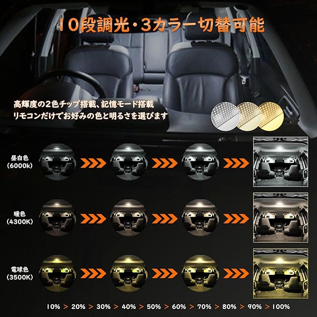 ✅「3色切替&1色ずつ10段階調光」:ホワイト とイエローの2色5050高輝度チップを採用、強力発光・広角照射で美しい発光します。車内にお好きな色 昼白色、電球色、ウォームホワイトの選びおよび明るさ10%/20%/30%/40%/50%/60%/70%/80%/90%/100%の輝度調整は1本のリモコンだけで操作できます。3カラーのledルームランプセットを装着すると車内の雰囲気を切り変わります。