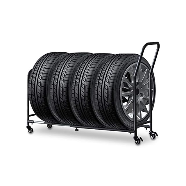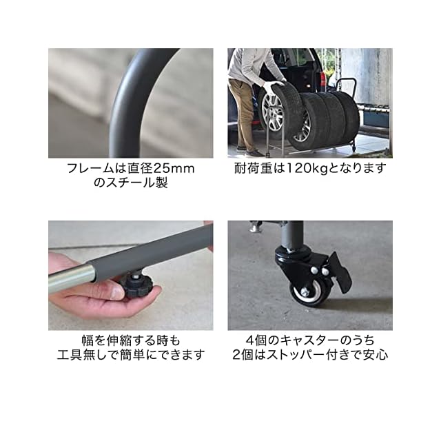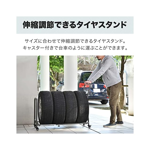 【伸縮調節できるタイヤスタンド】 サイズに合わせて伸縮調節できるタイヤスタンドです。キャスター付きで台車のようにタイヤを運ぶことができ、タイヤの移動から保管までこれ1台で可能です。スタッドレスやスペアの保管にオススメなアイテム。