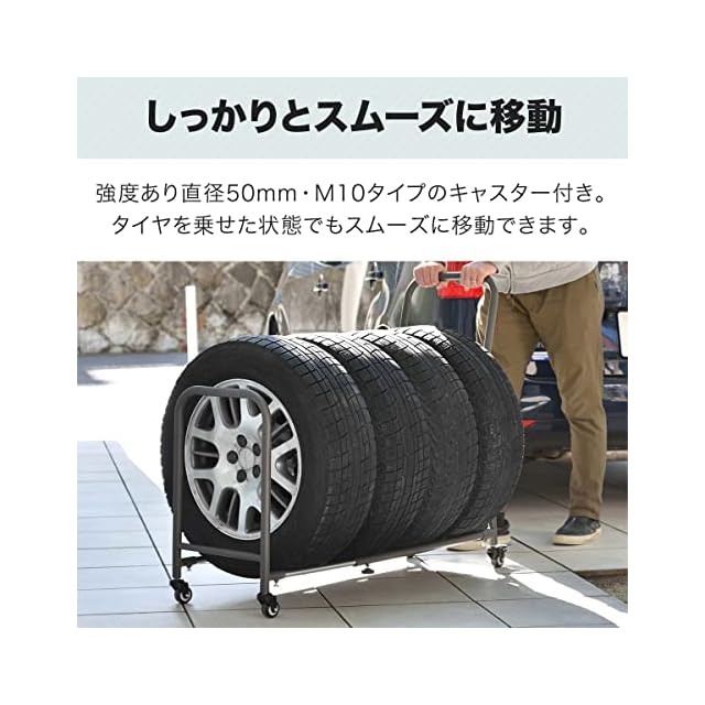 【強度あるM10タイプ・直径50mmのキャスター】 しっかりとスムーズに移動できる!強度あり直径50mm・M10タイプのキャスター付き。タイヤを乗せた状態でもスムーズに移動できます。またストッパーもついているので安心です。