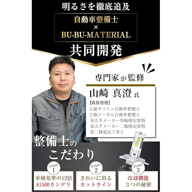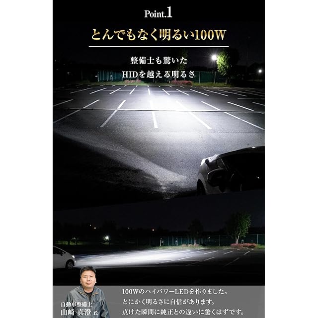 【自動車整備士の山崎氏が監修しました】●とんでもなく明るい81500カンデラ(実測)の LED ヘッドライト フォグランプ 。夜間走行が劇的に変わります。点けた瞬間、驚くほど明るい新世代LEDです●山崎氏が監修したこのLEDは、車検基準対応で遠方をくっきりと、進行方向センターをはっきりと明るく照らし、綺麗なカットラインでとても見やすい設計となっています。●こだわりのフィン形状ヒートシンク冷却システムは純銅基板との組み合わせで、点灯直後の明るさを維持し、長寿命化を実現しました。
