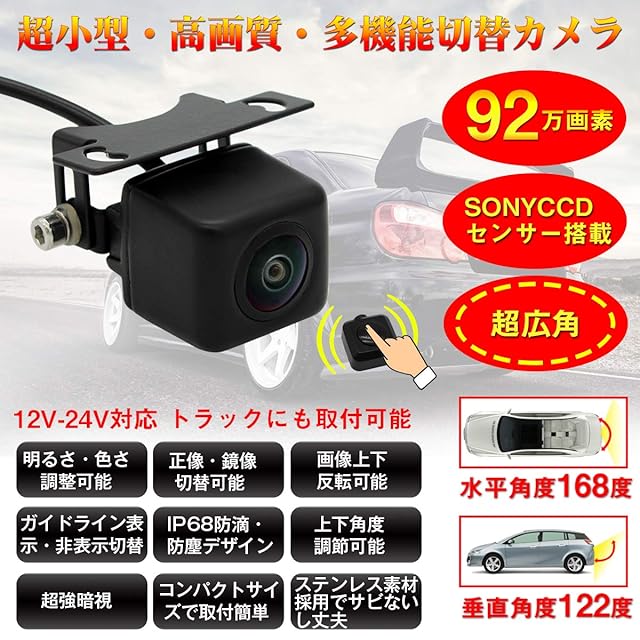 バックカメラ フロントカメラ/リアカメラ切替可能 SONY CCDセンサー採用で 92万画素 超暗視で夜でも見える 水平角度168°・垂直角度122°・視野角度230°超広角実現 12V-24V 汎用 トラック用も可能 リアビューカメラ明るさ・色さ調整可能 ガイドライン表示/非表示切替可能 防塵 防水IP68 超小型 角度調整可能 取付簡単 日本語マニュアル PORMIDO 36ヶ月保証有り