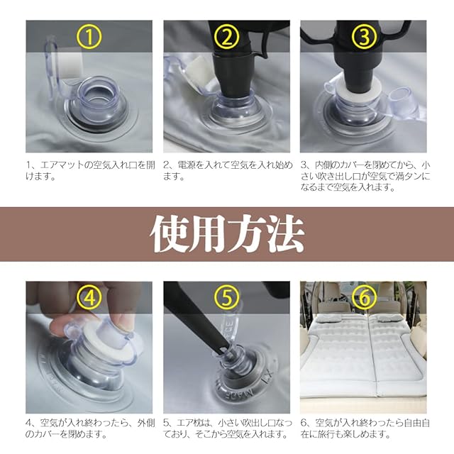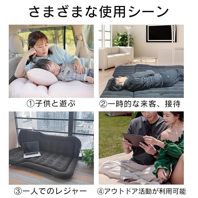 【使用簡単】車中泊マットは、空気を入れる用の電動ポンプが付き、わずか3~5分ほどでベッドが完成し、かなり便利です。また、空気を入れる量をご自由に調整でき、お好みの硬さが調整可能です。家でも車でも使えます。キャンプでも、気軽に持って行けます。アウトドアマット、キャンプマット、テントマットなど、さまざまな用途に使用されます。キャンプ、登山、キャンプ、オフィス、宿泊に使用できます