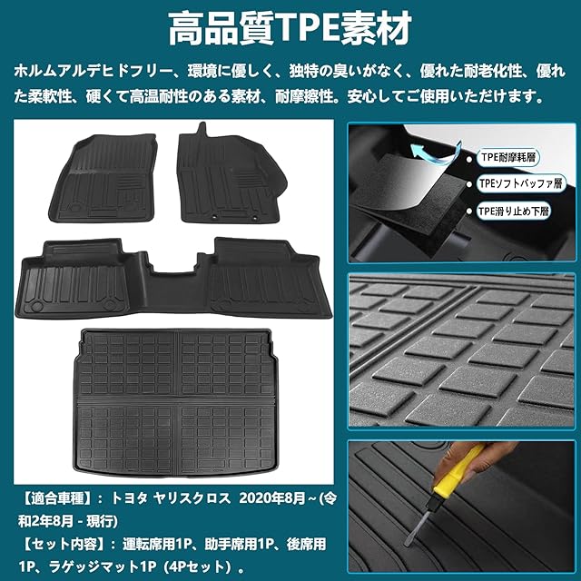 【適合車種】:トヨタ との互換性あり ヤリスクロス。セット内容:運転席用1P、助手席用1P、後席用1P、ラゲッジマット1P(4Pセット)。購入する前、画像にて形状、年式とモデルを確認してください。
