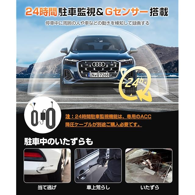 【24時間駐車監視&GPS搭載】このドラレコは24時間駐車監視機能、Gセンサーを内蔵し、万が一駐車中時に衝撃を受けると前後2台のカメラで撮影した映像を記録し保存します、携帯で映像を確認できる点も便利だし、証拠が残るので安心できます。さらに、GPS機能も内蔵しており、走行ルートや位置情報、運転履歴やルートを記録できます。(注:ドライブレコーダー24時間駐車監視機能は、専用のACC降圧ケーブルが別途ご購入必要です。)