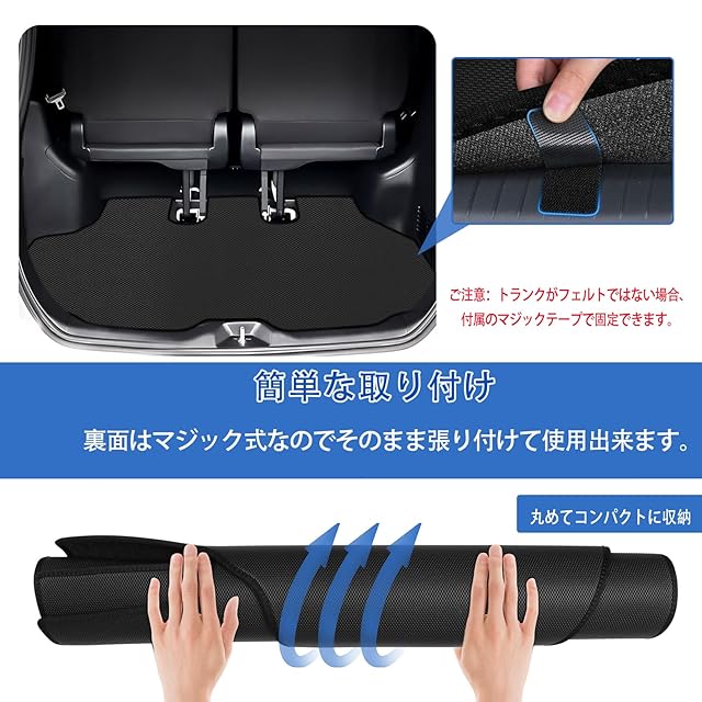 【巻ける収納&簡単な取り付け】:ラゲッジマットは、巻いて収納できるので、使用しないときはコンパクトにまとめてスペースを取らずに収納できます。使いたい時には、簡単に広げて取り付けるだけでOKです。初心者でも簡単に装着できます。トランクがフェルトでない場合、付属のマジックテープを利用して固定できます。
