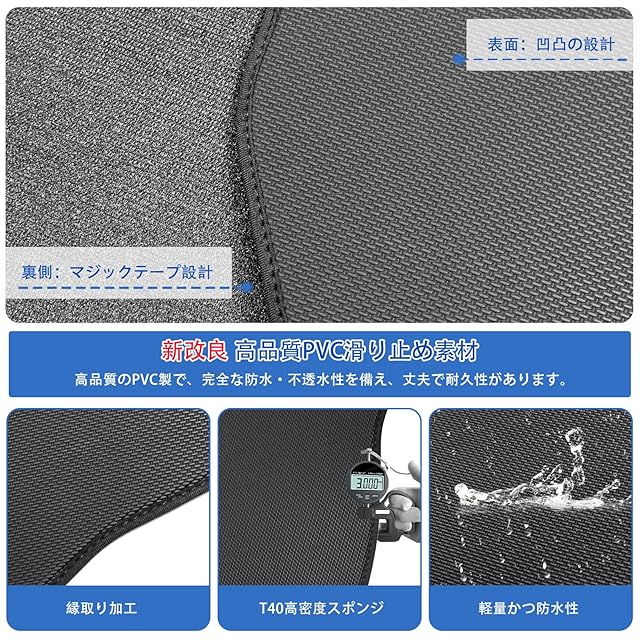 【新改良 高品質PVC滑り止め素材】:高品質なPVC素材を採用されたマットは、防水性、柔軟性、耐久性に優れた、曲げ癖や折跡が残りにくいです。ラゲッジマット表面は、PVC防水素材で凹凸があり、荷物の移動を防止し、水や汚れに強くて、汚れても水拭ができ手入れも簡単です。ラゲッジマット裏面はザラザラしたマジックテープ式で、マット全体がしっかりとグリップしてズレにくく、安全に快適に使えます。