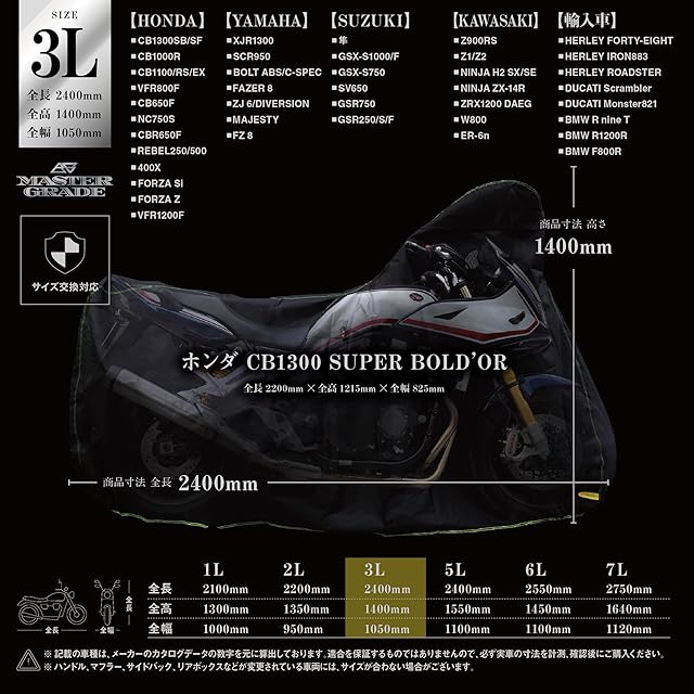 【所ジョージの世田谷ベース掲載】Barrichello(バリチェロ) バイクカバー MG 厚手 裏起毛 透湿 傷防止 UVカット 5層生地 BOX対応有 (3L(全長240cm×高さ140cm×幅105cm))
