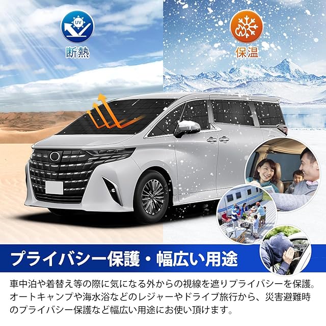 ✔4.【高品質素材・紫外線防止・トップレベルの保温性能】本製品の表面が特殊生地を採用して、夏は強い日差しを反射し、車内温度の上昇を抑えるとともに、紫外線や日差しから車内を守ります。冬は窓からの冷気の浸入を防ぎ、車内温度をキープして、車中泊も快適です。エアコンの効率も良くなるのでエコ対策にもオススメです。【軽量・クッション機能】芯材に軽量クッション素材を使用。ガラスの傷防止にも役立ちます。厚みのある素材ので、軽いくて落としにくいです。