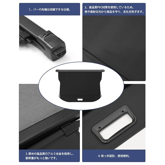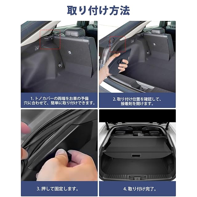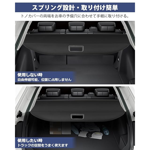 4.【車種専用設計・取付簡単】:車種専用設計のため、お車にピッタリフィットします。ネジや両面テープを使わず、加工もせず、手軽に取り付けられます。トノカバーの両端をお車の予備穴に合わせて簡単に取り付けすることができます。普段は自由に伸縮でき、簡単に切り替えが可能です。取付注意事項:①まずフックの取付位置を確認して、雑巾か何かでフックの貼る位置をきれいにします。②取付補助用の白いシートを開けて、もう一度フックの貼る位置をこすります。乾いていないうちにフックの裏面に貼ってある赤い膜を剝がして取り付けてください。取り付け後、三十分以上待ってからご使用ください。