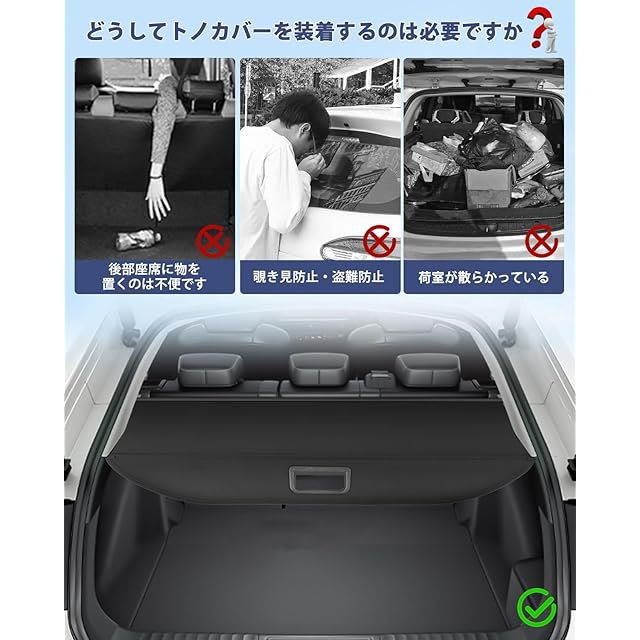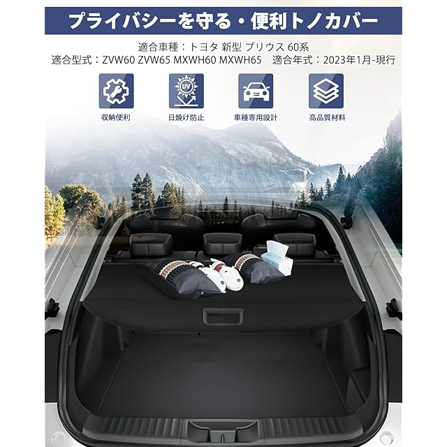 1.【適合車種】:トヨタ 新型 プリウス 60系。型式:ZVW60 ZVW65 MXWH60 MXWH65。年式: 2023年1月-現行。注意事項:製品画像とお車をご確認頂き、お買い求め下さい。【セット内容】:トノカバー×1PCS、フック×2PCS、取付補助用の白いシート×2PCS、予備用両面テープ。※本製品は特許権を有しておりますので、類似・模倣のことをご遠慮ください!