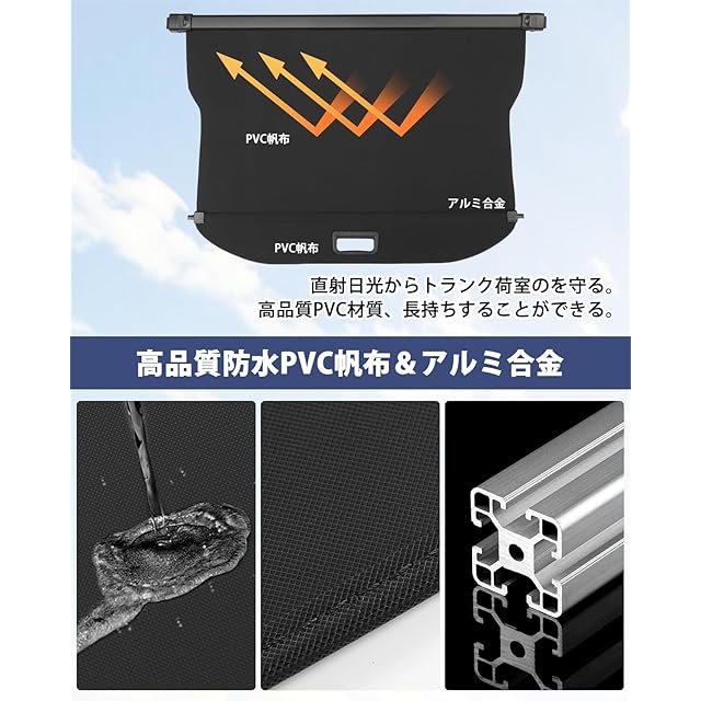 2.【高品質のPVC材質&アルミ合金】:耐熱性、耐摩擦、耐汚れに優れた高品質PVC材質を使用しているため、熱や直射日光から商品を守り、劣化を防ぎます。また、耐久性にも優れていて、長持ちすることができます。表面が防撥水加工されているので、水をこぼれても心配ありません。