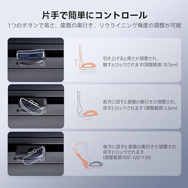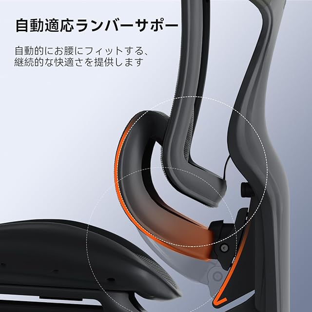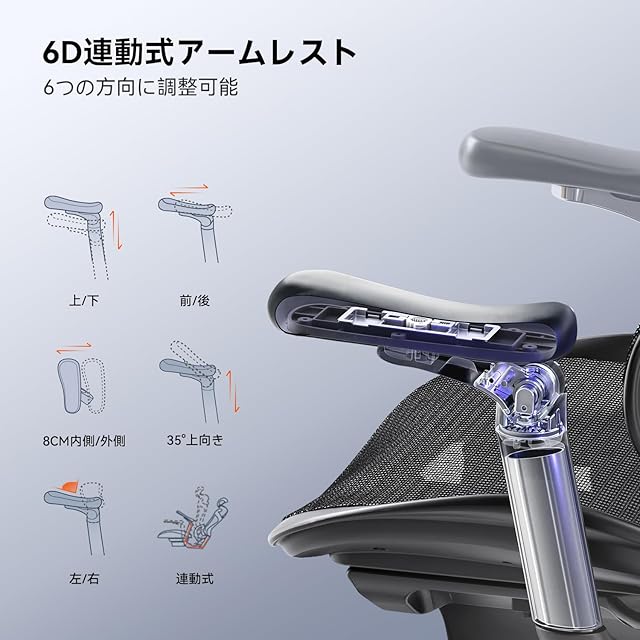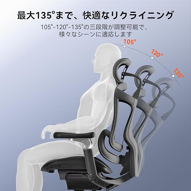 【連動式の6Dアームレスト&最大135度までリクライニング調整】このSIHOO Doro C500椅子は連動式6Dアームレストを搭載し、上下昇降6.5cm、左右回転75°、跳ね上げ角度35°、前後5cm、内外8cmの細かい調整が可能。どんな体勢でもあなたにフィットする自由度の高さが魅力です。さらに、3段階のリクライニング機能を採用し、最大135度まで角度を調整可能。作業中のリラックスタイムや仮眠時にも、なめらかな動きで最適な姿勢をサポートします。C500は、あなたの動きに合わせてシームレスに変化し、仕事と休息の両方で最高の快適さを提供します。
