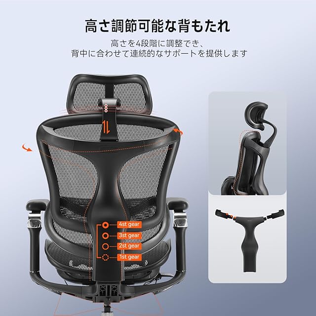 【広角調整ヘッドレスト・追跡できる背もたれ】SIHOO オフィスチェアはオートマトン広角調整の3Dヘッドレストを採用し、昇降4.5CM、前後6.5CMと20°角度調整ができます。オートマトンで細かい範囲を調整できます。柔らかいメッシュの素材から作られ、肌に優しくてサポートもしっかりでよりよく頭部を支えます。最新的な三角柔軟性の弾性フレームから作られる背もたれは、両側の肩から腰部まで三角のサポーターを設計し、背中に強い支えを提供します。そして、背もたれが体や座り姿勢により移動することができ、いつでもしっかりと背部をサポートします。更に、背もたれの昇降が調整可能で、異なる身長の方々に対応できて便利です。4段階で6CMの昇降を調整できます。背もたれを最上の段階に調整する時、自動に1段階に戻ります。