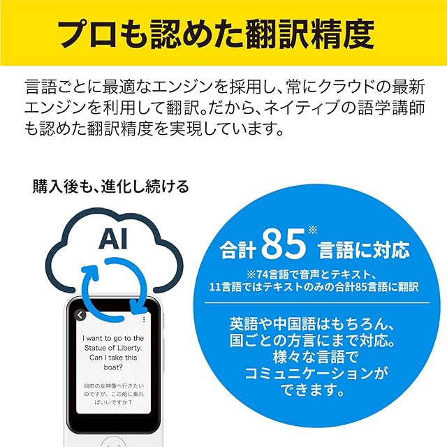 【こだわりの翻訳精度】ポケトークは言語ごとに最適なエンジンを採用し、常にクラウド上の最新のエンジンを利用して翻訳。だから、ネイティブの語学講師も認めた翻訳精度を実現しています。