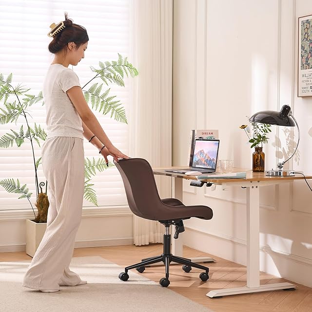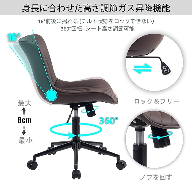 【高品質の素材】このデスクチェアは優れたフェイクレザー、オリジナルのスポンジと高品質金属で作られています。二重車輪と安定した5つ星ベースの椅子は強いです。表面のラッカーは新しくアップグレードされ、デスクチェアを傷つきにくくします. コンパクトで肘のないデザインは、このローリングデスクチェアをホームオフィスでの使用に特に適しています。さらに、この調節可能なローリングチェアは、ドレッシングチェア、ソーイングチェア、釘打ちチェア、タスクチェア、ワーキングチェア、勉強机の椅子やコンピュータゲームチェア、会議室の椅子などとしても使用できます