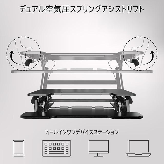 デュアルガススプリングシステム – 両側に同期したデュアルガススプリングを備えた広々とした幅81.3cm x 奥行52.2cmのデスクトップにより、15cmから44cmまで安定した高さ調整が可能で、座っている時と立っている時の両方の作業姿勢に最適です。スタンディングデスク 卓上タイプとしても使用可能。