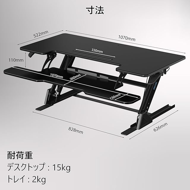 デュアルガススプリングシステム – 両側に同期したデュアルガススプリングを搭載した広々とした幅107cm x 奥行52.2cmのデスクトップにより、高さ調整が15cmから44cmまで安定して行え、座って作業する場合と立って作業する場合の両方に最適です。スタンディングデスク 卓上タイプとしても使用可能。
