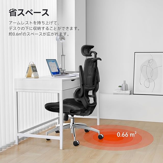 「3D跳ね上げ式アームレスト&スペースを最大限に」オフィスチェアは3D跳ね上げ式のアームレストが付いており、前後4CM調整と左右29°回転可能です。90度回転できるように設計されているため、快適で自由な作業空間を作成できます。必要に応じてアームレストをおろして、肘を支え、携帯電話をしたり、本を読んだり、ぼんやりしたりするのも快適です。使わない時にアームレストを引き上げると、机の高さを選ばずにスッキリと収納でき、約2㎡のスペースを節約し、お部屋のスペースを有効に活用できます。