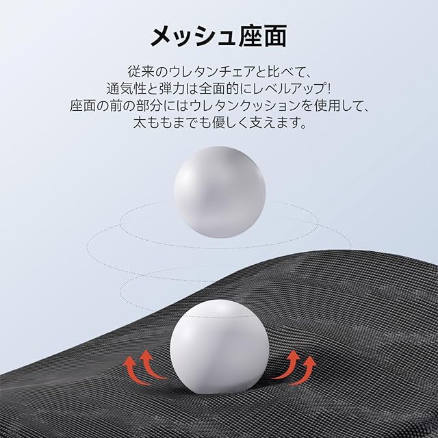 「高性能メッシュ材料&床にキズが付きにくい静音キャスター」オフィスチェアの座面は高性能のメッシュで通気性強い、さらに、お尻の曲線に応じてデザインされており、お尻や太ももを優しく包み込み、体圧をより良く分散することで、長時間座ってもお尻が痛く感じられません。オフィスチェアは静音PUキャスターを採用して、移動音が静かで床にキズが付きにくいです。