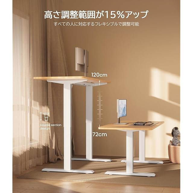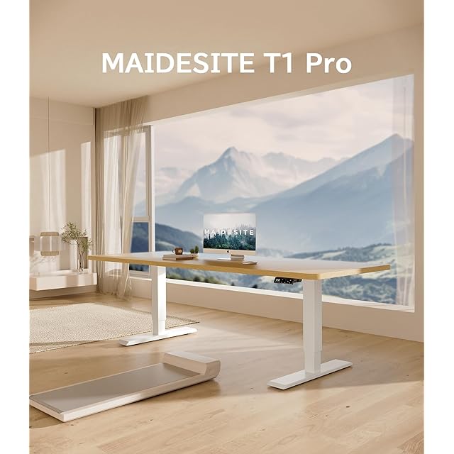 【MAIDeSITe T1 Pro 昇降式デスク 脚のみ】初心者向けのコンパクトな昇降デスクで、長時間座ったまま作業に対する良い電動昇降デスクです。身長が低い学生の「座り」を想定した72cmから、背が高い男性が「立つ」作業できる120cmまで広い範囲での昇降を実現しています。インテリアに調和する天板を自由に選べます。