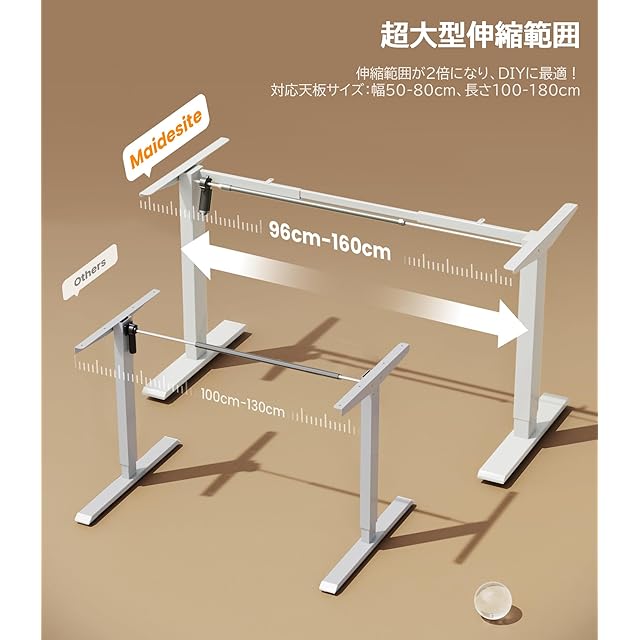 【コスパ最高 無段階高さ調整】高さは72〜120cmまでの調整ができ、伸縮範囲は96-160cmまでの調節ができます。昇降速度:30mm/s、耐荷重:80kg。DIYでお好みの天板を選べ、対応できる天板サイズ:長さ(100-180cm)横幅(50-80cm)厚さ(2cm以上)。