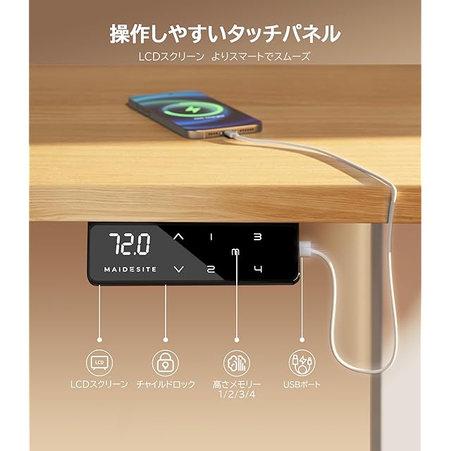 【メモリー機能4つ 多機能タッチパネル】高さを登録できるため、気に入った高さに素早く調節可能。姿勢を変換して作業しましょう。メモリー機能:よく使用する4つの高さを記憶して一押しだけで記憶した高さに戻ります。衝突検知機能:上下昇降中に障害物にぶつかると自動で約3cm戻る安全装置があることも魅力です。ロック機能:誤って触ってしまった場合でも動作しないようにロックして好奇心の強い子供達も守ります。USB機能:バネルの横側にUSB端子が搭載され、充電が効率的になれ、作業も便利になります。