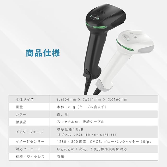 型番:1950GHD-1USB 本体サイズ:(L)104mm × (W)71mm × (D)160mm 重量:本体 160g(ケーブル含まず) インターフェース: USB(HIDキーボード, COMポートエミュレーション) カラー:白 付属品:スキャナ本体, 接続ケーブ