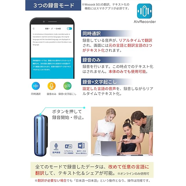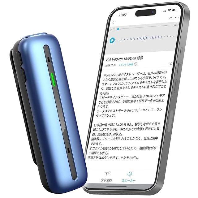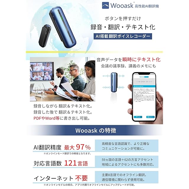 Wooask S01 ボイスレコーダー 翻訳機 文字起こし 121言語対応 【議事録を不要に。録音したデータを0.5秒で翻訳して、文字起こしして、書き出す。】 翻訳精度97% ウーアスク ノイズ軽減 小型 軽量 (オン・オフラインに対応)