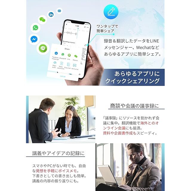【文字起こしデータをファイル化】録音されたデータは瞬時にWordファイルもしくはテキストファイルに変換可能。「LINE」「Googleドライブ」「Slack」「Dropbox」「Gmail」「E-Mail」などスマートフォン対応したあらゆるアプリに共有が可能です。