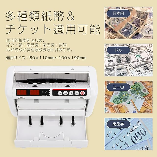 【紙幣はもちろん、券類も対応】国内外紙幣をはじめ、ギフト券・商品券・図書券・封筒・はがきなど多種類な券類も計数でき。(お札のサイズによって検別、カウント可能なサイズ:50×110mm~100×190mm)