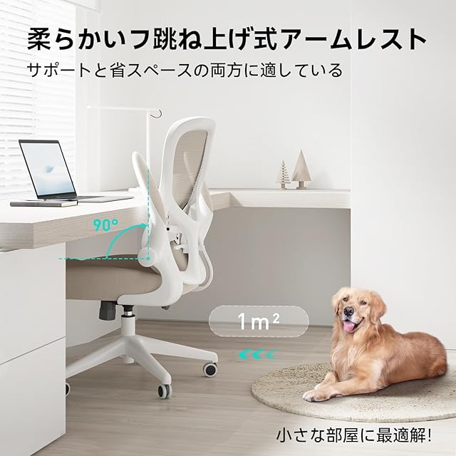【空間配慮・跳ね上げ式アームレスト】 ロータリーアームを採用します。デスクにアームが当たる事なくデスク下に収納する事が可能です。手前に引くだけで簡単に上げ下ろしできます。スッキリ収納でき、省スペース!!