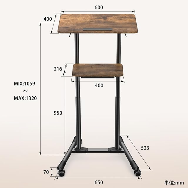 【製品仕様】高さ1059~1320mm ・天板:幅600mm x 奥行き400mm 耐荷重:約20kg ・棚板:幅400mm x 奥行き216mm 耐荷重:約10kg ・素材:メラミン化粧板、合金鋼 ・重量:約9.5kg ※測定値であり、保証値ではありません。