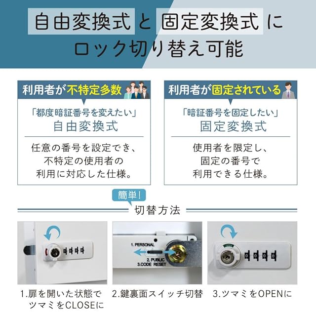 本製品は暗証番号仕様を2通りの方法から選択することができる貴重品ボックスです。(初期設定はパブリックに設定されています) ■パブリック(自由変換式)施錠時に任意の番号を設定でき、不特定の使用者の利用に対応した仕様 ■パーソナル(固定変換式)使用者を限定し、固定の番号で利用できる仕様