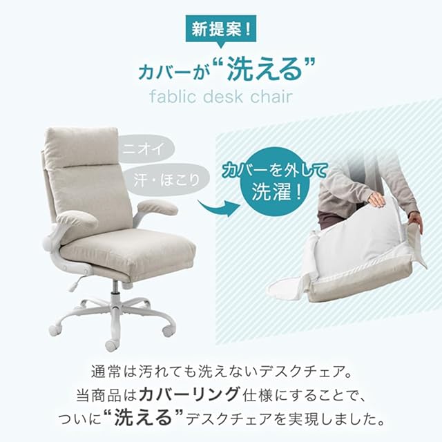 【スタッフのおすすめポイント】 ・いつも清潔!洗えるカバーリングデスクチェア・お部屋に馴染むファブリックデスクチェア・ソファのような座り心地、肉厚クッション・デスクにスッキリ収まる可動式アームレスト・一休みに伸びができるロッキング機能・デスクや体型に合わせて使える6cmガス昇降・床に傷がつきにくいPUキャスター