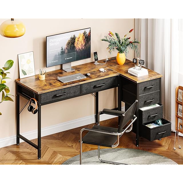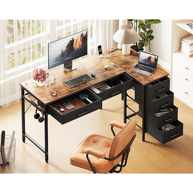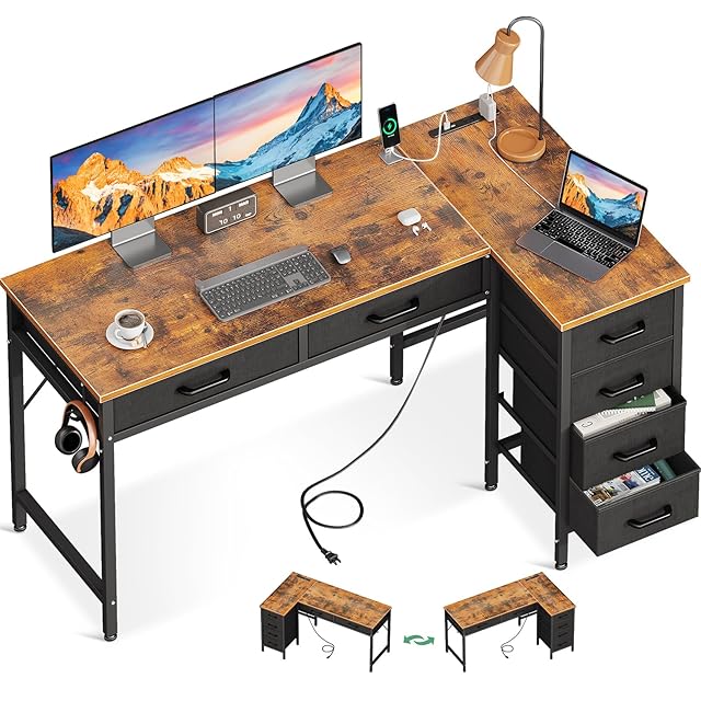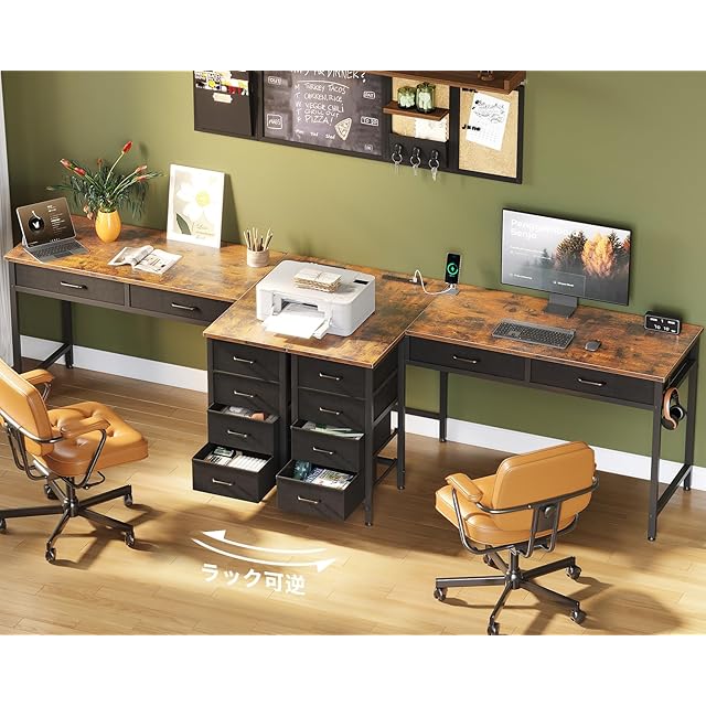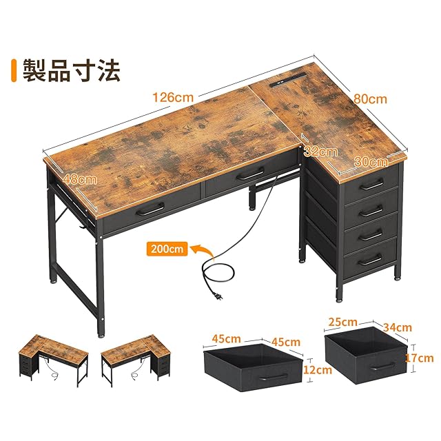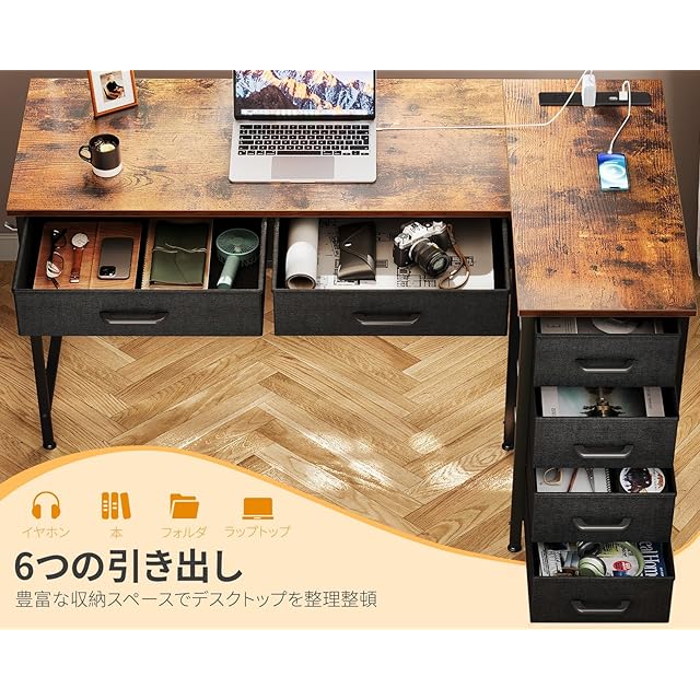 AODK L字デスク パソコンデスク デスク ゲーミングデスク コンセント付き 右棚左棚 PCデスク 引き出し6杯付き 幅126cm 多層収納 頑丈フレーム 省スペース オフィスデスク 学習机 北欧風 家庭用/オフィス用 大容量収納 組立簡単 在宅勤務 ビンテージ