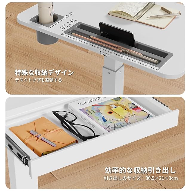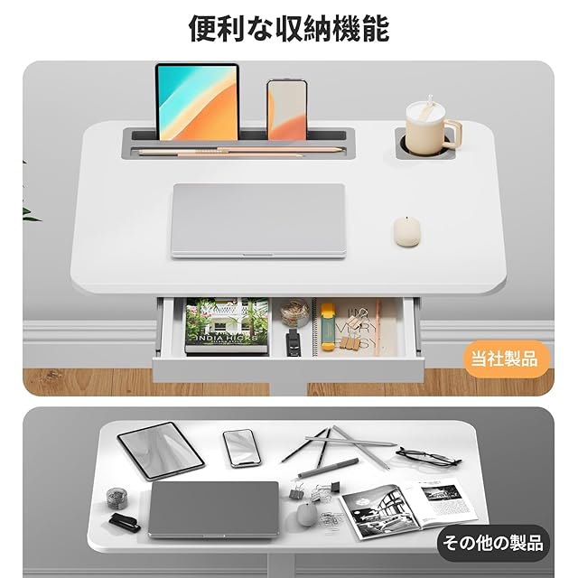【十分な収納スペース】このスタンディングデスクは36×21×3cmサイズの引き出しがあり、文房具や本などを収納できます。また、天板の上にPad用の置物台とカップホルダーが付いており、水筒やタブレットを置くことができます。さらに、天板の下には2つのフックがあります、ランドセルやヘッドフォンなどの物を掛けることができます