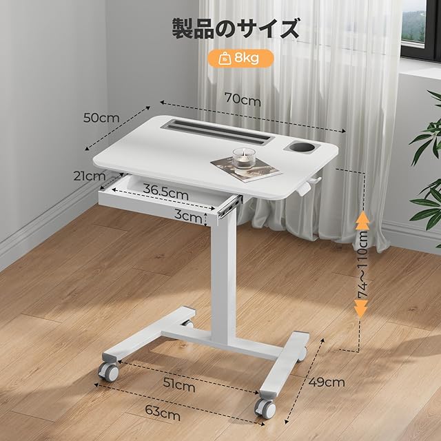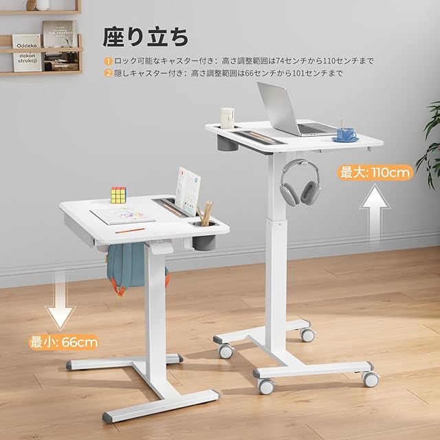 GIBBON MOUNTS 昇降デスク 幅70cm×奥行き52cm 移動式 スタンディングデスク 高さ調節76-111cm 小さめ 可動式テーブル 2種類のキャスター選択可能 パソコンデスク テレワーク 在宅ワーク 引き出し付き Pad用溝付き カップホルダーと2つフック付き おしゃれ ホワイト白