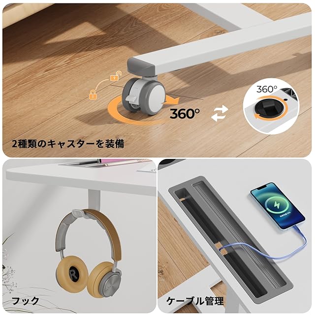【2種類のキャスター選択可能】この昇降デスクは本来4つ隠しキャスターが付いており、ベースの高さはわずか3cmで、狭いスペースにも簡単に押し込んで使用できます。しかし、隠しキャスターはカーペットの上ではスムーズに移動しないから、異なる使用シーンに応じて交換できるように、特別に4つのロック可能な大きいキャスターを設計しました