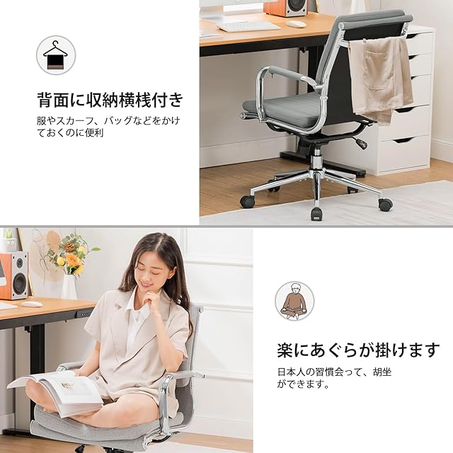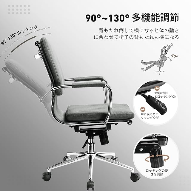 【季節を問わず、人気チェア】モダンな金属工業風、今の人気スタイルです。前後調節可能なアームレストカバーで、冬は手を暖かく保ち、夏は涼しく感じられます。また、オックスフォード布は、木製ベースよりも弾力性があり、スプリングのような座り心地で、長時間座っても凹みが回復します。通気性の高い麻布も採用しています。130°ロッキング機能や背もたれに服を掛けることができる横桟など、様々な機能が備わっています。