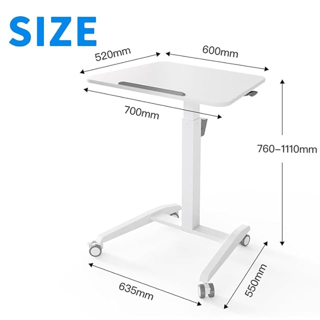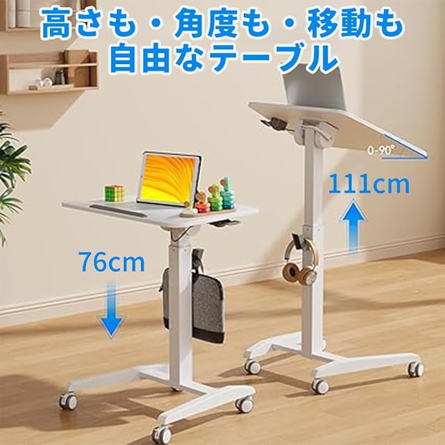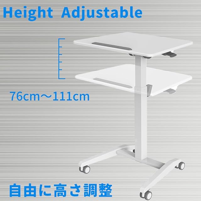 【仕様】天板サイズ70*52*60cm/高さ調整:76-111cm/角度調整:0-90°/キャスター:360°回転(ロック機能有)/耐荷重:30Kg/重量:12Kg/材質:合金鋼,HDPE